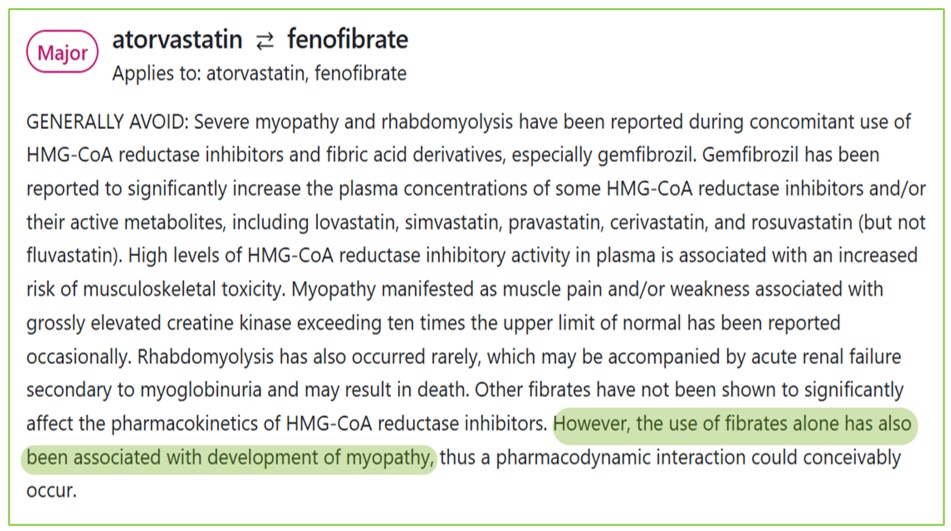 Về mặt lý thuyết, fenofibrat và atorvastatin có thể gây tương tác ở mức độ major (nghiêm trọng). Theo Drug.com, sự phối hợp này có nguy cơ tăng nguy cơ độc tính trên cơ. Một số fibrat (đặc biệt là gemfibrozil) có thể làm tăng nồng độ statin trong huyết tương, tuy nhiên fenofibrat không ảnh hưởng rõ đến dược động học của statin. Tuy vậy, fenofibrat bản thân cũng đã có nguy cơ gây bệnh cơ, nên khi phối hợp, nguy cơ này có thể cộng gộp (tương tác dược lực học). Tuy nhiên, không nằm trong nhóm chống chỉ định bắt buộc theo Quyết định 5948/QĐ-BYT.