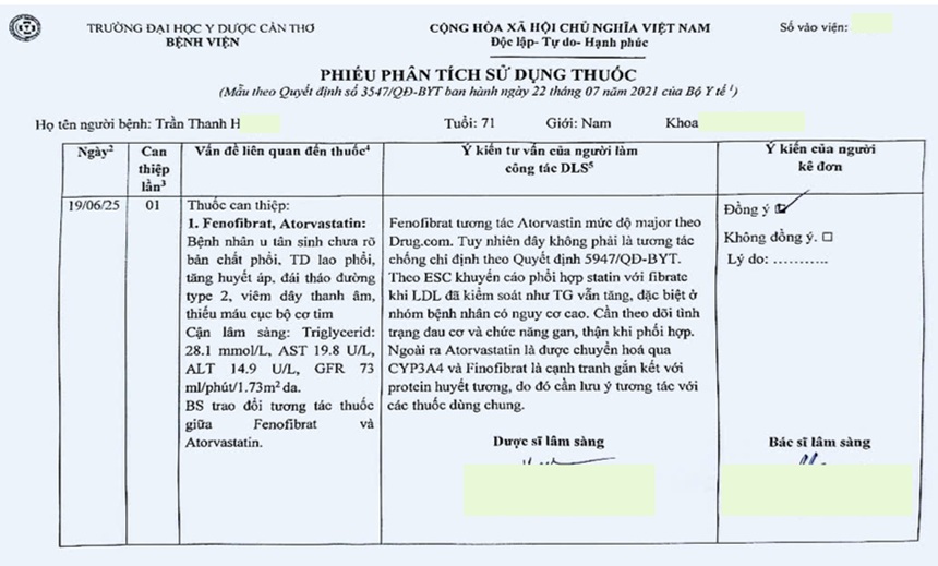 Người bệnh đang được kê hai thuốc có khả năng tương tác: Fenofibrat và Atorvastatin, nhằm điều trị rối loạn lipid máu hỗn hợp (tăng cholesterol và triglycerid). Tuy nhiên, việc phối hợp này khiến bác sĩ lâm sàng lo ngại về nguy cơ tương tác thuốc có thể ảnh hưởng đến an toàn cho người bệnh, đặc biệt là ở nhóm người cao tuổi và có nhiều bệnh nền.