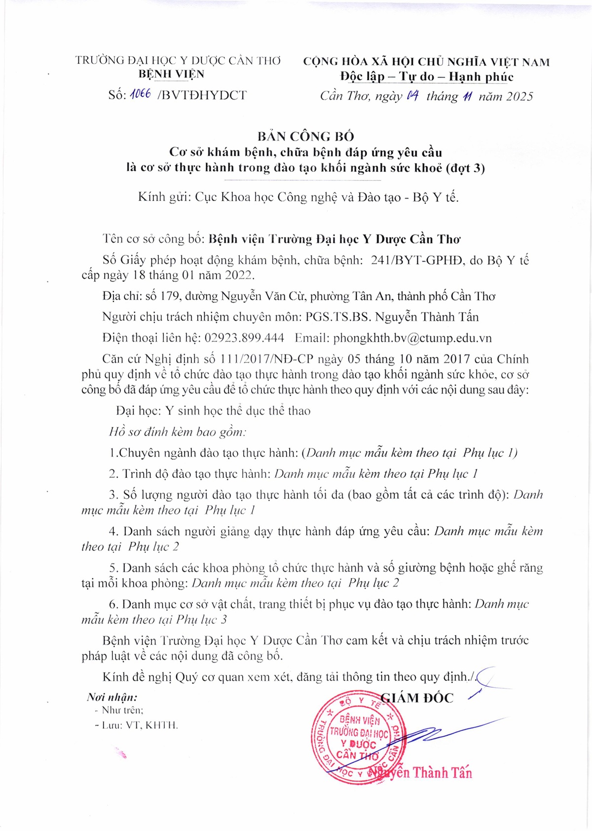 Bản công bố Cơ sở khám bệnh, chữa bệnh đáp ứng yêu cầu là cơ sở thực hành trong đào tạo khối ngành sức khoẻ (đợt 3)