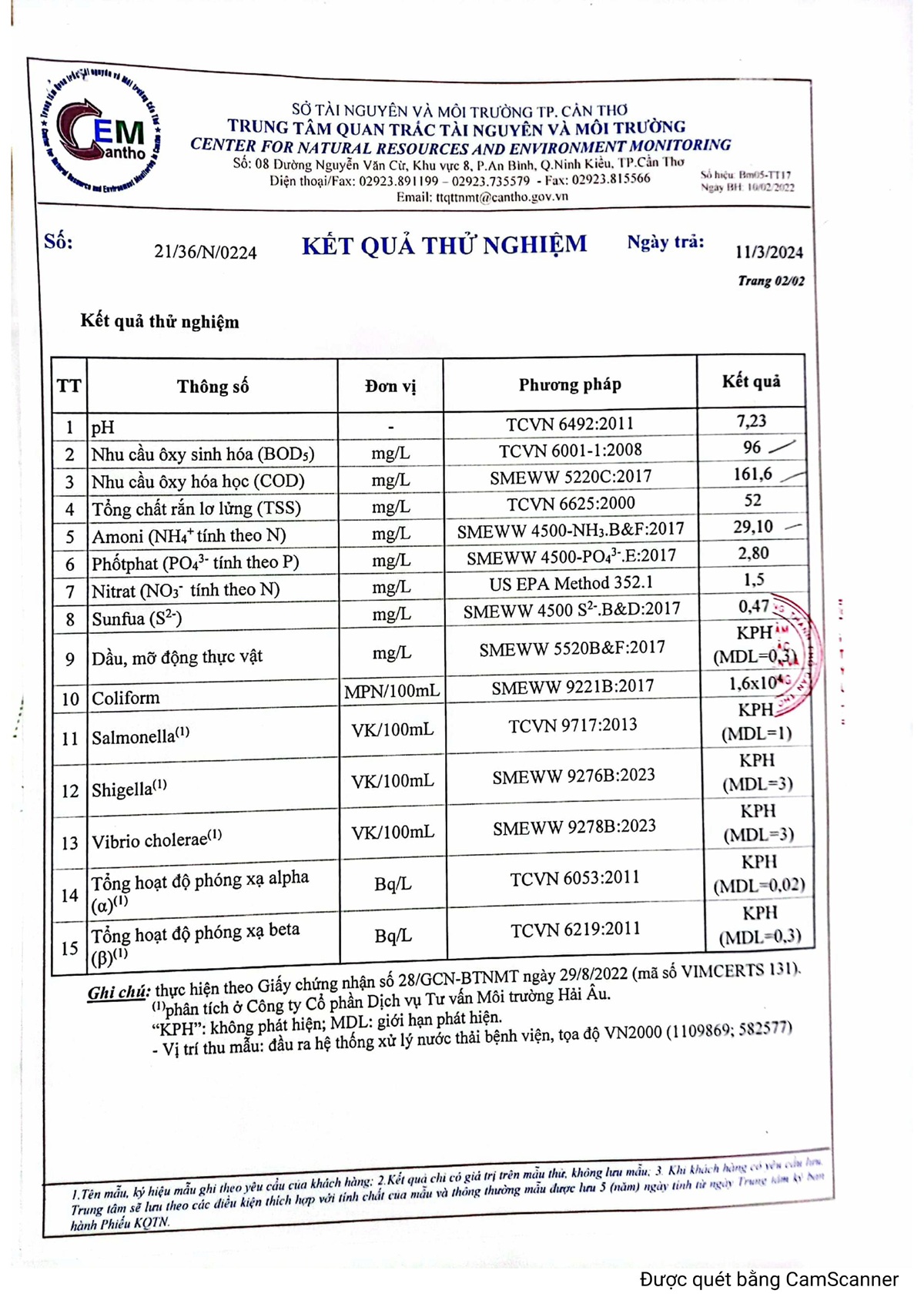 Kết quả quan trắc nước thải quý 1 năm 2024 của Bệnh viện Trường Đại học Y Dược Cần Thơ.