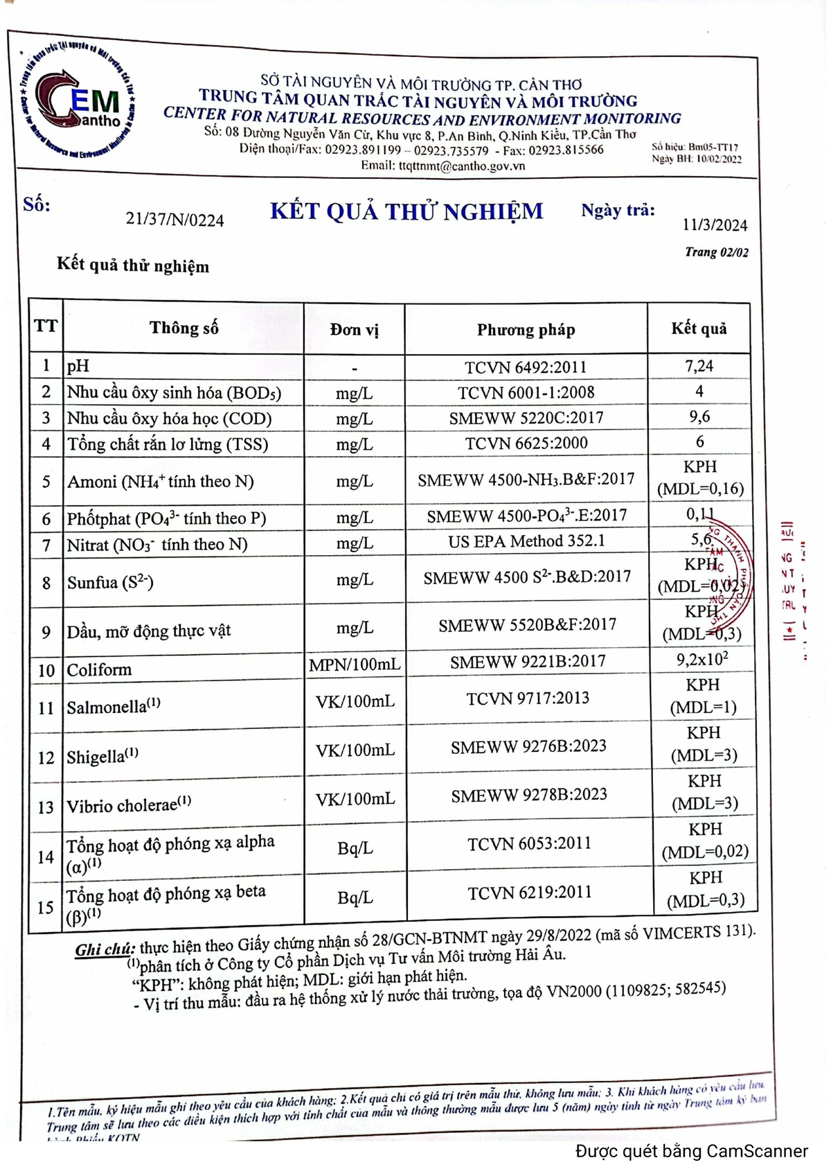 Kết quả quan trắc nước thải quý 4 năm 2024 của Bệnh viện Trường Đại học Y Dược Cần Thơ
