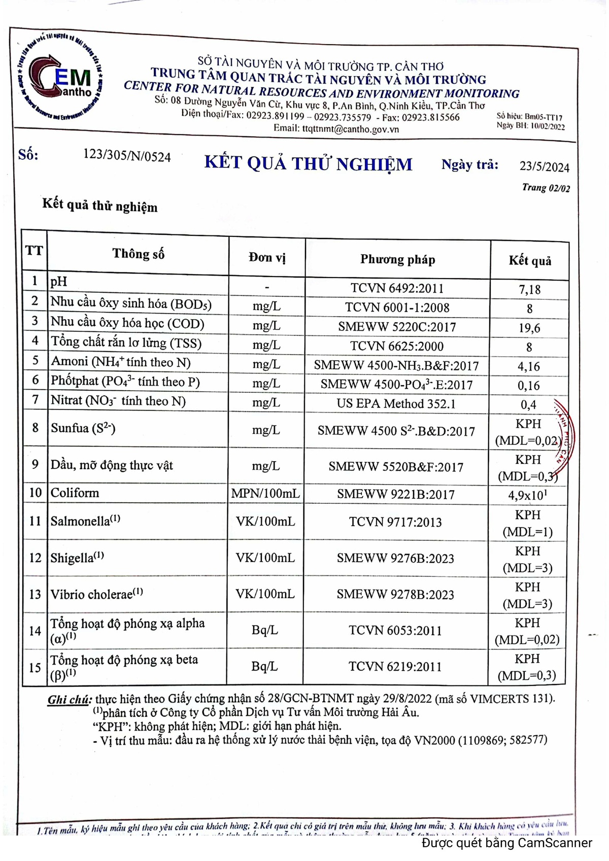 Kết quả quan trắc nước thải đột xuất năm 2024 của Bệnh viện Trường Đại học Y Dược Cần Thơ