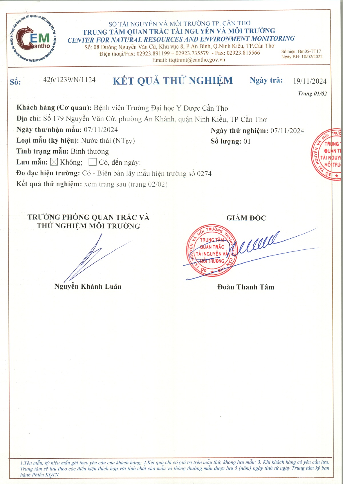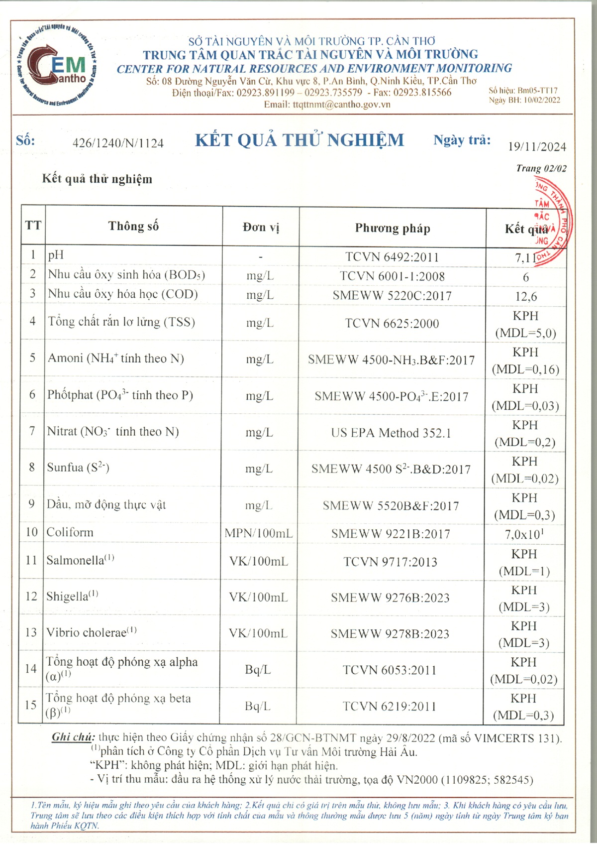 Kết quả quan trắc nước thải đột xuất năm 2024 của Bệnh viện Trường Đại học Y Dược Cần Thơ