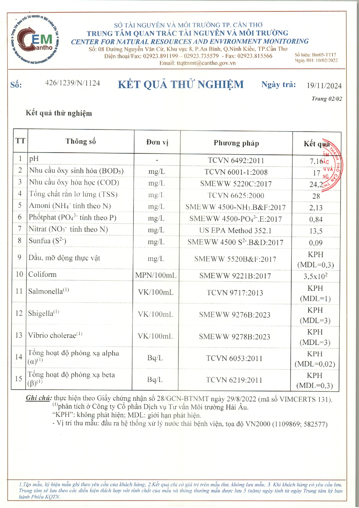 Kết quả quan trắc nước thải quý 3 năm 2024 của Bệnh viện Trường Đại học Y Dược Cần Thơ