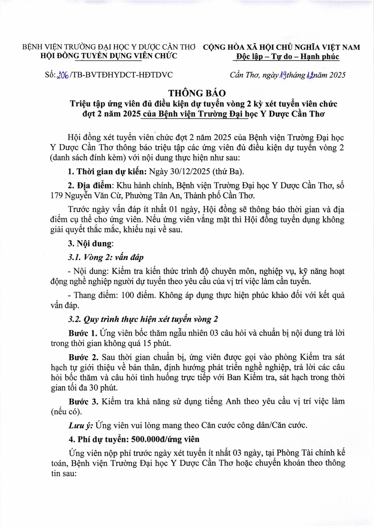 Thông báo số 206 triệu tập ứng viên đủ điều kiện dự tuyển vòng 2 kỳ xét tuyển viên chức đợt 2 năm 2025 của Bệnh viện Trường Đại học Y Dược Cần Thơ