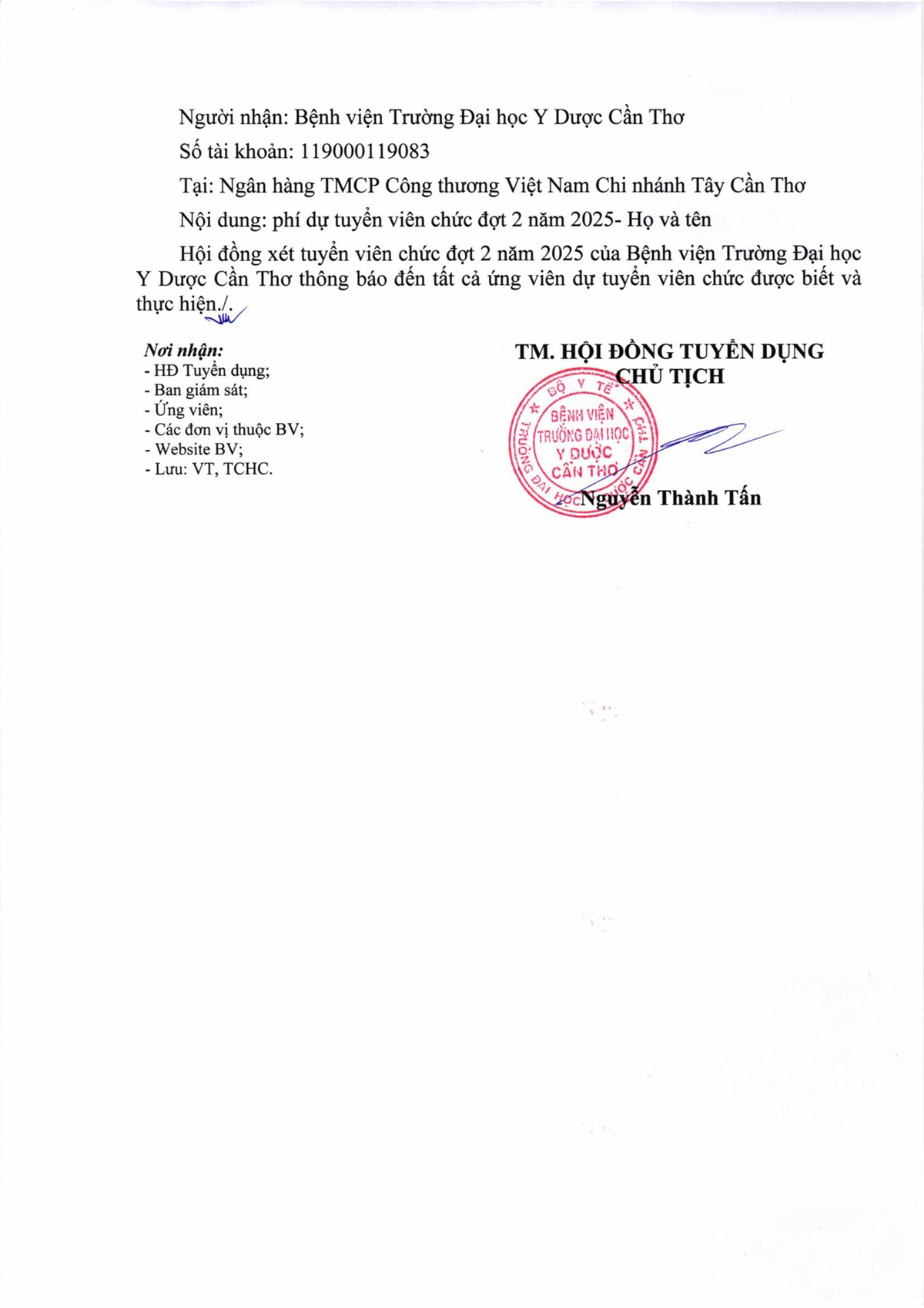 Thông báo số 01 Kết quả tuyển dụng viên chức đợt 2 năm 2025 của Bệnh viện Trường Đại học Y Dược Cần Thơ