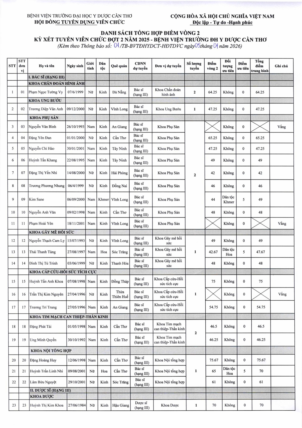 Thông báo số 01 Kết quả tuyển dụng viên chức đợt 2 năm 2025 của Bệnh viện Trường Đại học Y Dược Cần Thơ