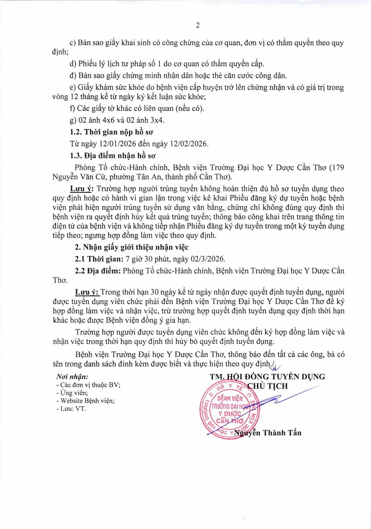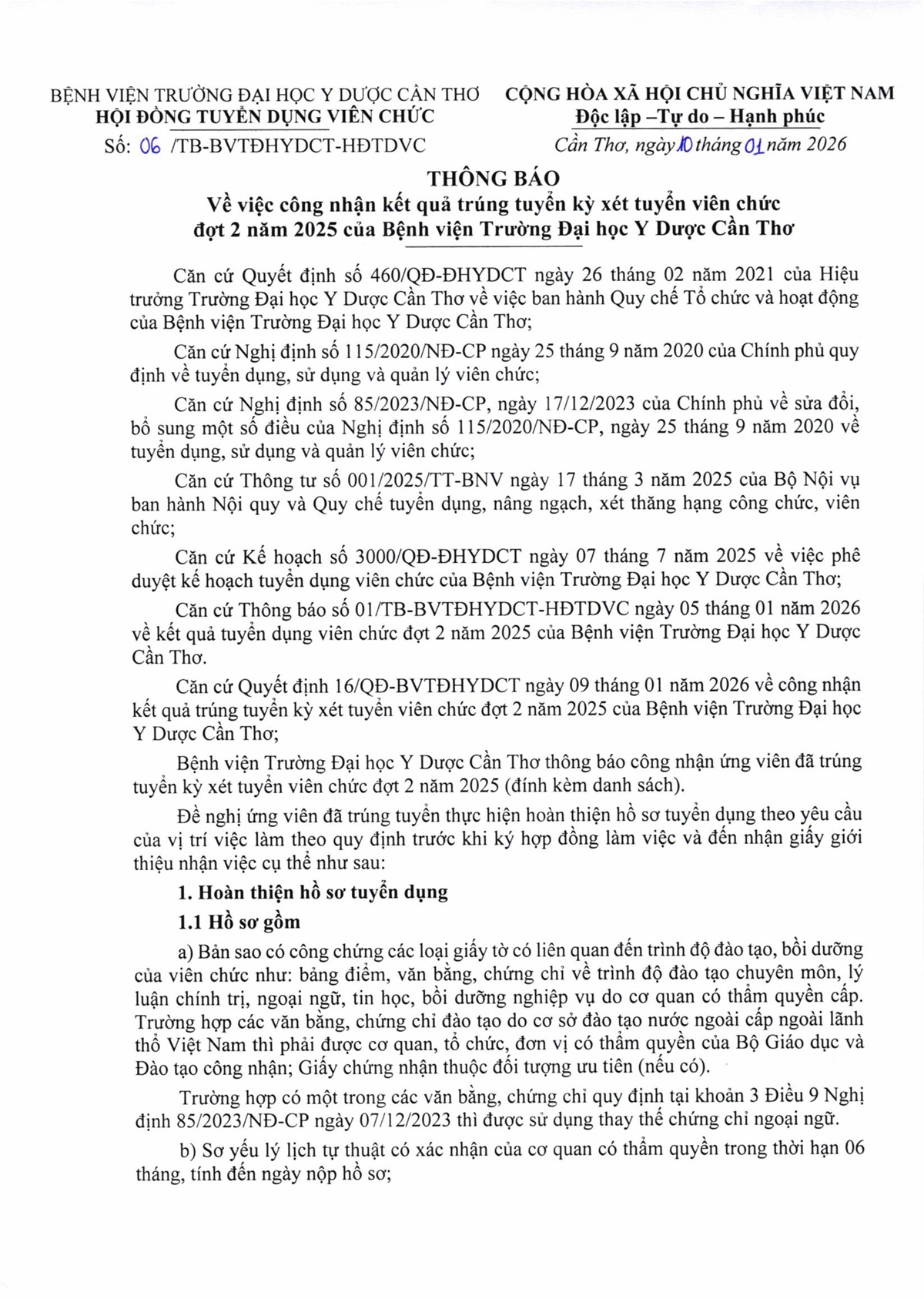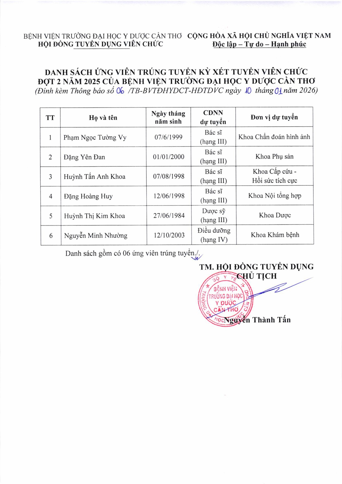 06 công nhận kết quả trúng tuyển kỳ xét tuyển viên chức đợt 2 năm 2025 của Bệnh viện Trường Đại học Y Dược Cần Thơ.