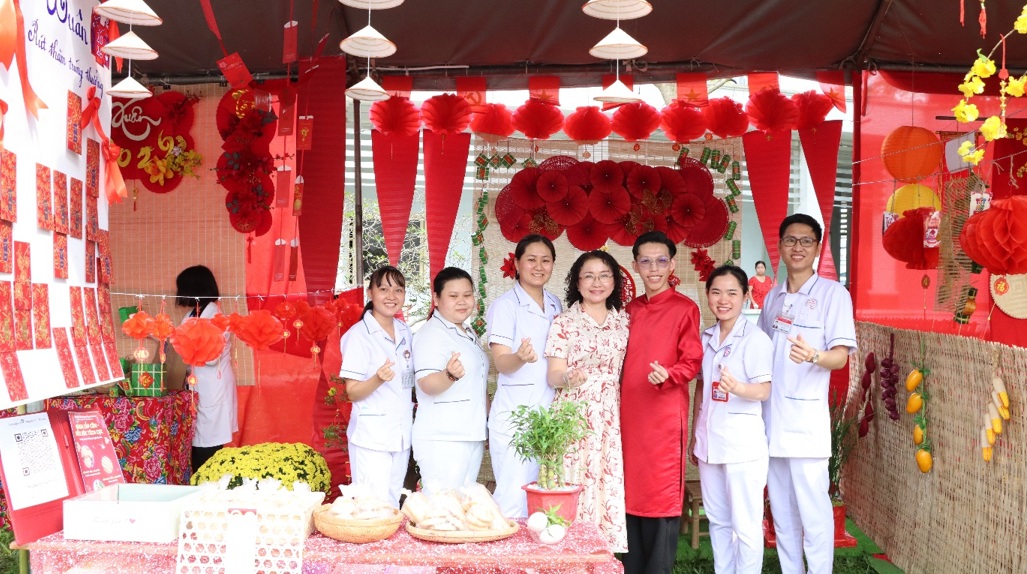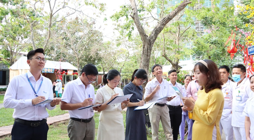 Đồng hành và tiếp thêm động lực cho hội thi, Cô PGS.TS Nguyễn Minh Phương đã trực tiếp đến tham quan từng gian hàng trong hành trình đầy cảm hứng – như một cuộc du Xuân thu nhỏ giữa lòng bệnh viện. Từ sắc đỏ rộn ràng của câu đối, sắc vàng mai đào đến những vật liệu mộc mạc được tái chế tinh tế, tất cả hiện lên như những “trạm dừng Xuân” giàu bản sắc. Những lời chúc mừng ấm áp cùng sự động viên chân thành của Cô đã góp phần làm cho hành trình du Xuân ấy thêm trọn vẹn, lan tỏa niềm vui và khí thế thi đua sôi nổi đến từng đội thi.