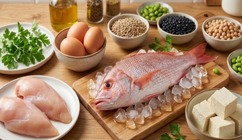 Protein giúp duy trì khối cơ và tăng cảm giác no trong quá trình giảm cân. Các nguồn protein lành mạnh gồm: Cá, ức gà bỏ da, trứng, đậu hủ, các loại đậu. Ngoài ra, theo khuyến nghị của ASN cho thấy chế độ ăn cung cấp khoảng 1,0–1,6 g protein/kg cân nặng/ngày có thể giúp duy trì khối cơ trong quá trình giảm cân.