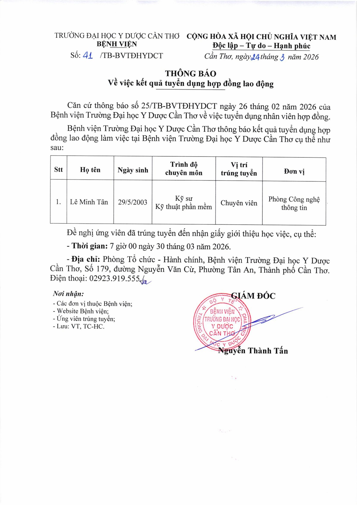 Thông báo số 41 về việc kết quả tuyển dụng hợp đồng lao động.