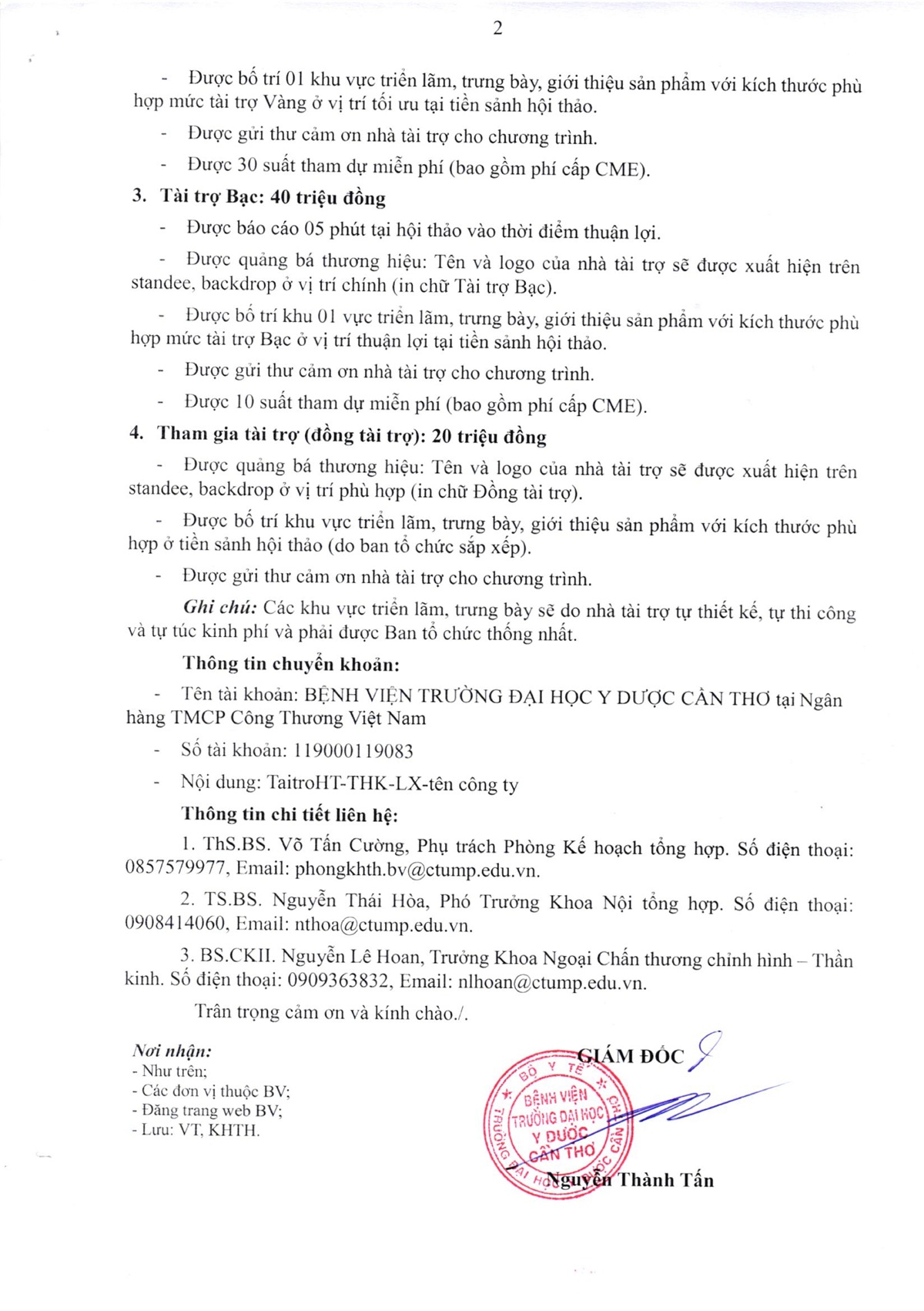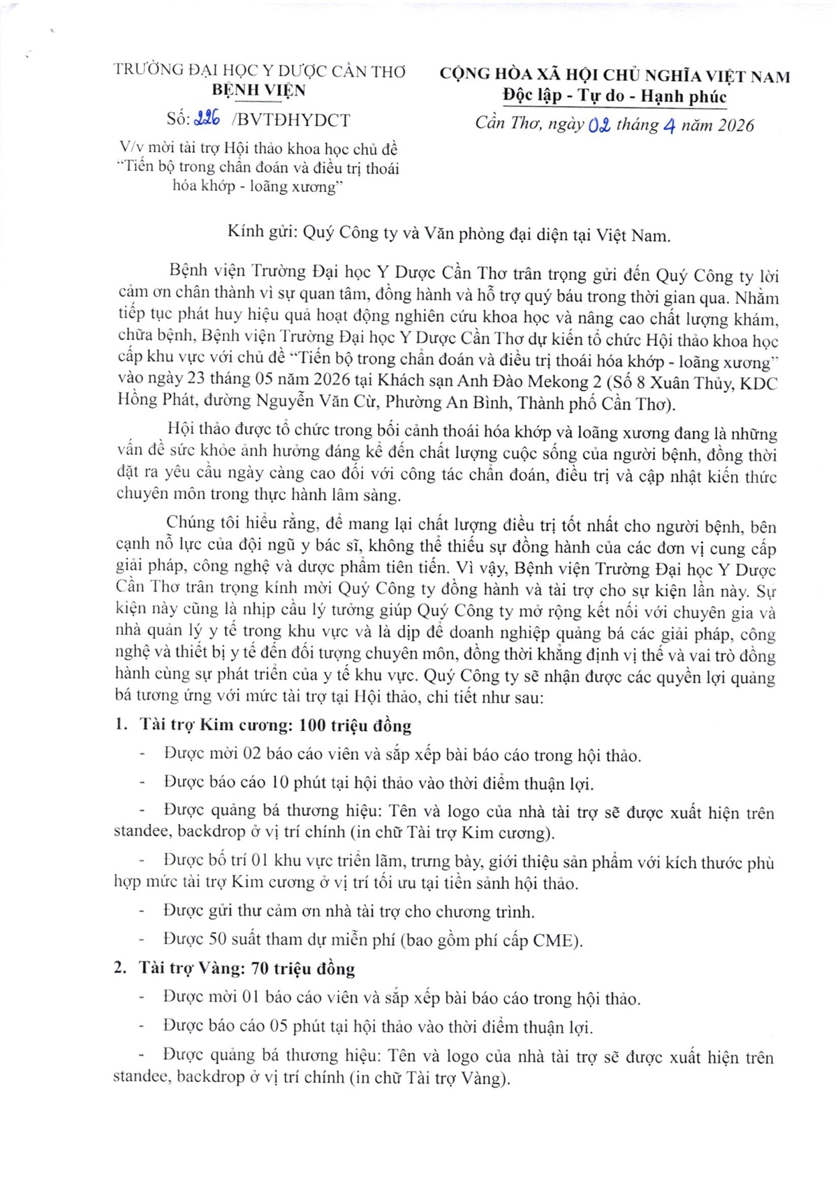 BỆNH VIỆN TRƯỜNG ĐẠI HỌC Y DƯỢC CẦN THƠ MỜI DOANH NGHIỆP ĐỒNG HÀNH CHUỖI HỘI NGHỊ – HỘI THẢO KHOA HỌC NĂM 2026.