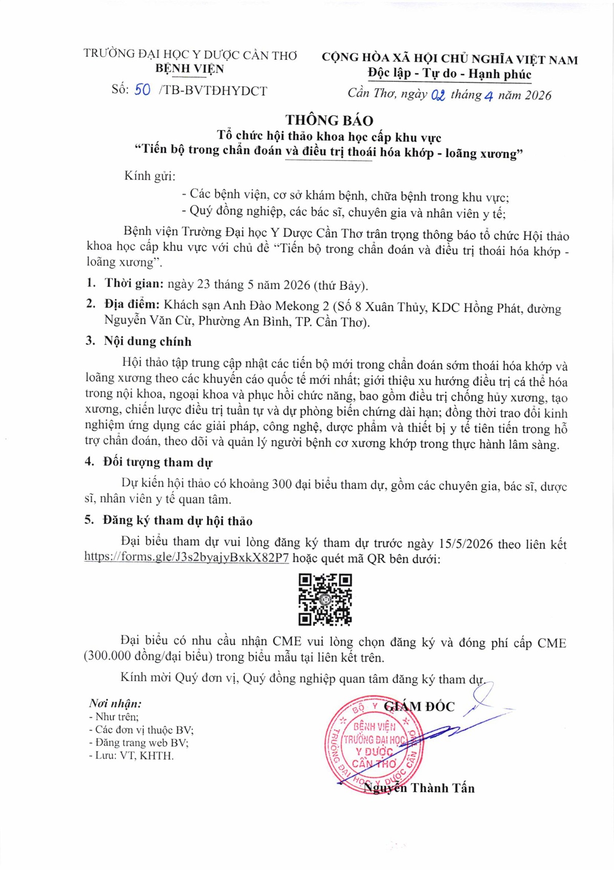 Thông báo số 50 tổ chức hội thảo khoa học cấp khu vực "Tiến bộ trong chẩn đoán và điều trị thoái hóa khớp - loãng xương".
