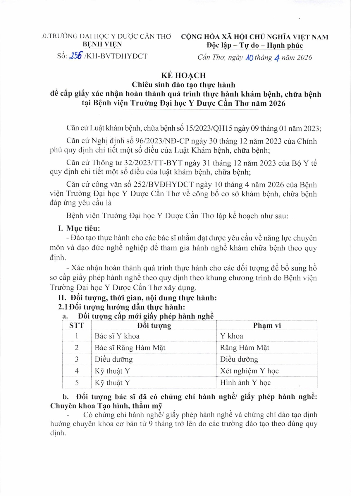 Kế hoạch số 256 chiêu sinh đào tạo thực hành để cấp giấy xác nhận hoàn thành quá trình thực hành khám bệnh, chữa bệnh tại Bệnh viện Trường Đại học Y Dược Cần Thơ năm 2026.
