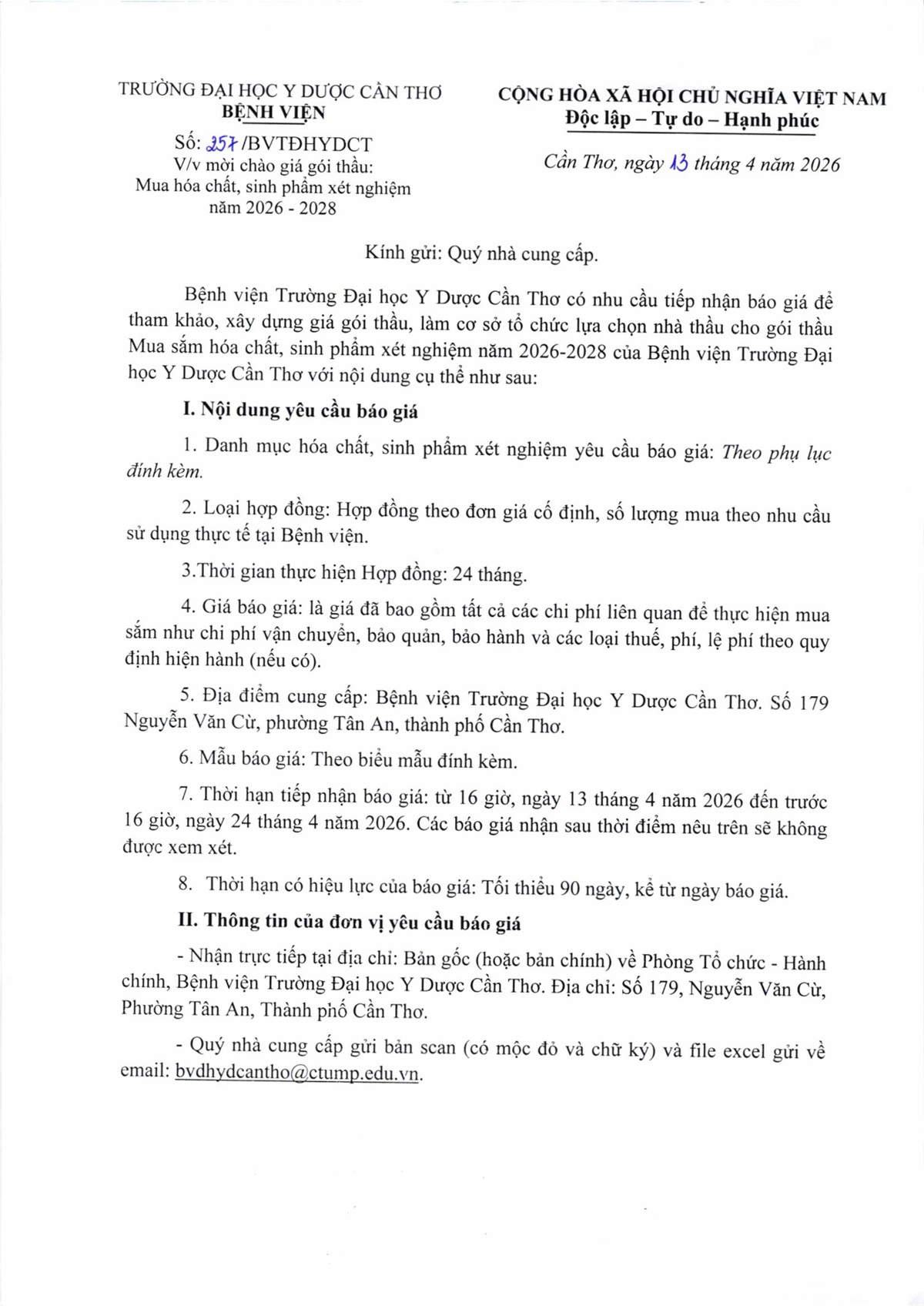 Về việc mời chào giá gói thầu: Mua hóa chất, sinh phẩm xét nghiệm năm 2026-2028