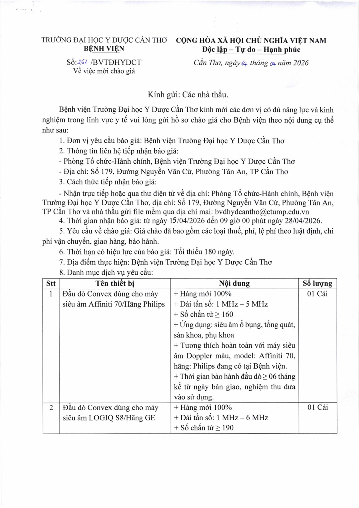 Về việc yêu cầu báo giá thuốc sử dụng tại Bệnh viện Trường Đại học Y Dược Cần Thơ